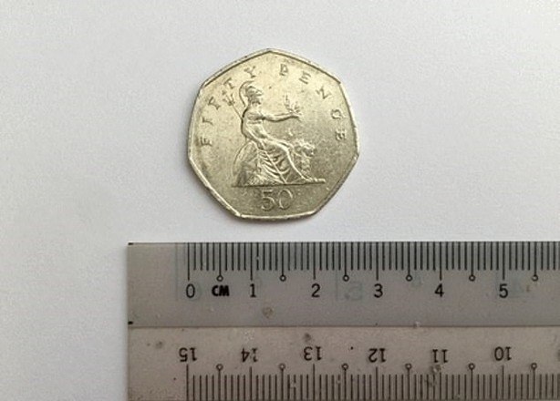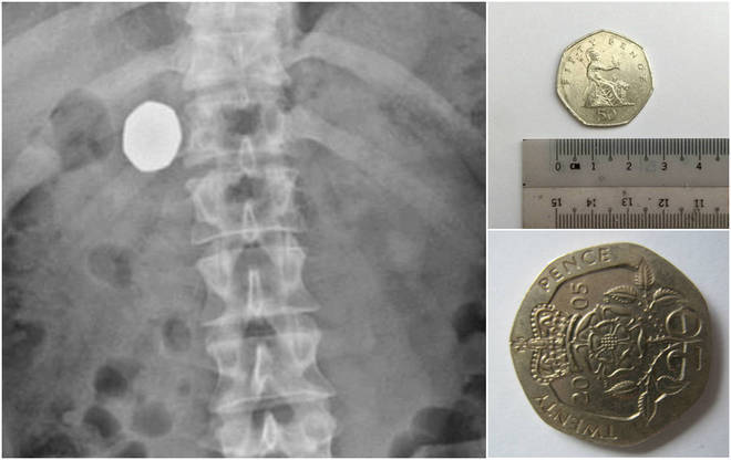 Ele decidiu visitar um médico ao não conseguir regurgitar a moeda maior, de 2,5 cm e valor de 50 centavos de libras