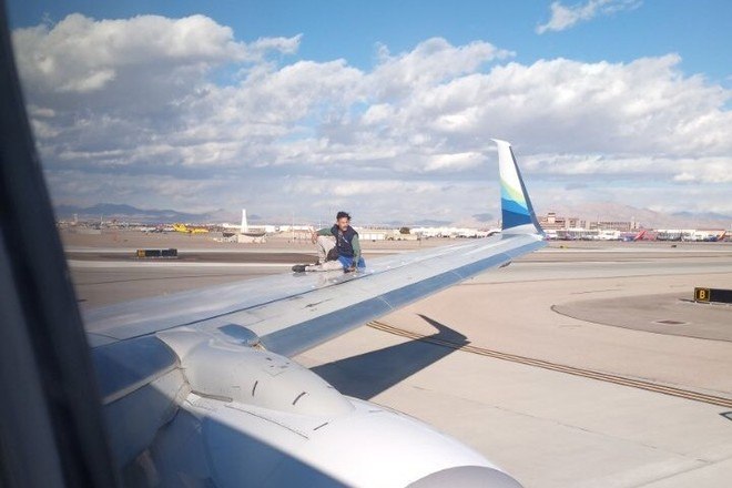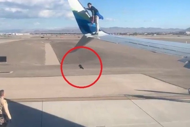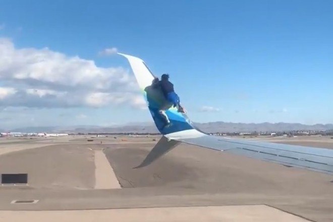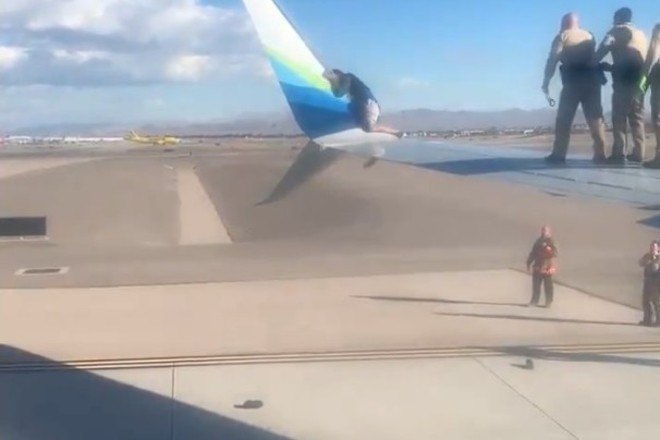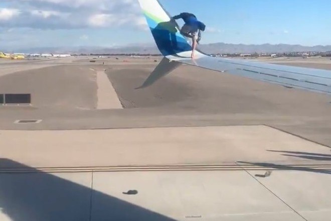 Uma homem não identificado acabou detido após empoleirar na asa de um avião e retirar os sapatos, sem nenhum motivo aparente