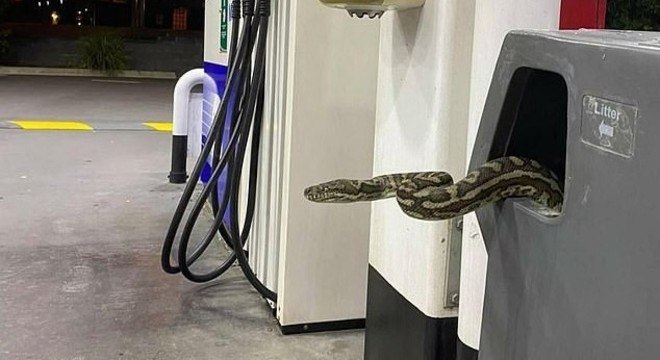 Uma píton-carpete provocou o fechamento de uma bomba de gasolina em um posto de Gold Coast, na Austrália, para que fosse removida de uma lixeira. A imagem da serpente, compartilhada no Facebook pela página Snake Catchers Brisbane & Gold Coast, viralizou nas redes.