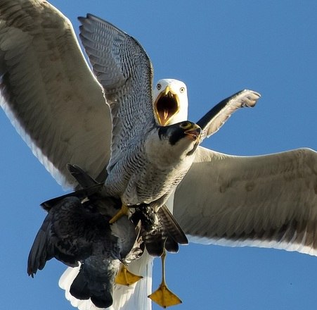 Segundo Chris, que estava na região em um passeio agradável com a esposa Kim, foram cinco ou seis gaivotas envolvidas no ataque. O falcão conseguiu escapar, mas as gaivotas ficaram com a pomba que ele havia caçado. Será esse o primeiro capítulo de uma revolta contínua de gaivotas contra os falcões-peregrinos? Acompanhemos atentos tais possíveis mudanças na cadeia alimentar