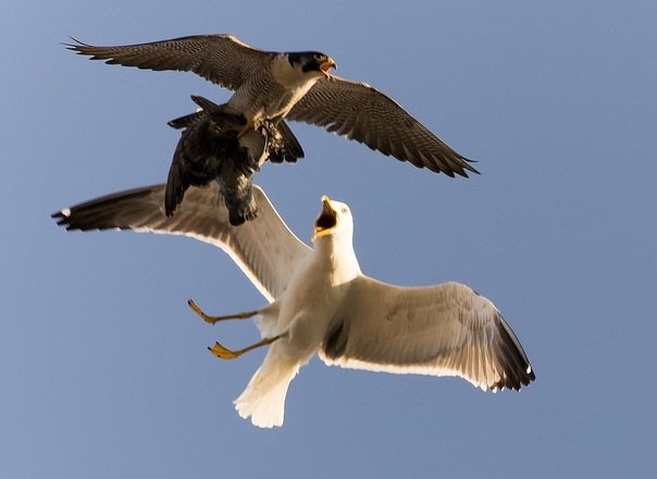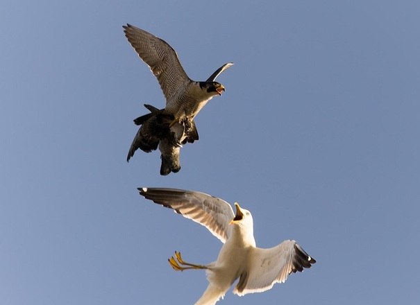 O falcão-peregrino é considerado o animal mais veloz do mundo, alcançando cerca de 320 km/h. Mas nem toda essa velocidade e agilidade o livrou do grupo de gaivotas ousadas
