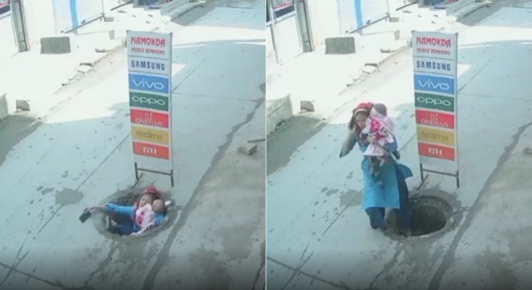 Uma mãe com bebê no colo despencou em um bueiro enquanto conversava ao celular. O incidente foi registrado por uma câmera de vigilância da cidade de Faridabad, na Índia.