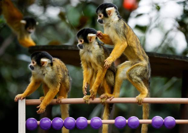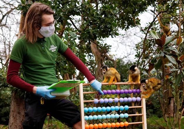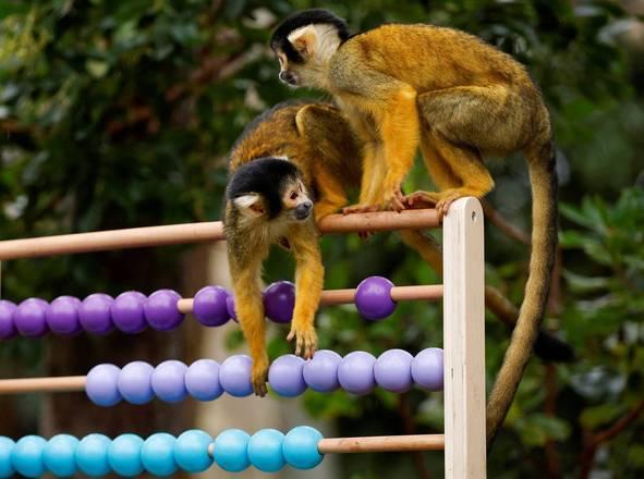 Imagens como desses macacos-esquilo brincando com um ábaco, enquanto são examinados e contados