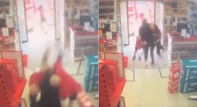 As imagens mostram o suspeito agarrado pelos funcionários após uma aparente tentativa de fuga