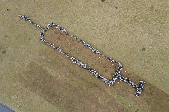 Enquanto uns têm o Zé Gotinha, outros fazem campanha pró-vacinação utilizando um pastor alemão e 700 ovelhas e cabras, que formaram uma seringa gigante. A formação foi registrada por um drone, no sul de Hamburgo, Alemanha