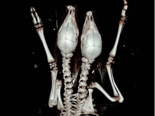 Exames laboratoriais revelaram que os cervos tinham pelos, cabeças e pernas normais, mas internamente tinham um fígado compartilhado, baços e tratos gastrointestinais extras