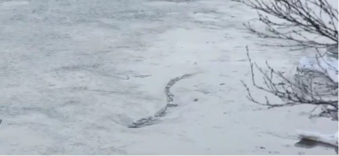 No vídeo, o animal gigante nada rápido pelas águas congeladas