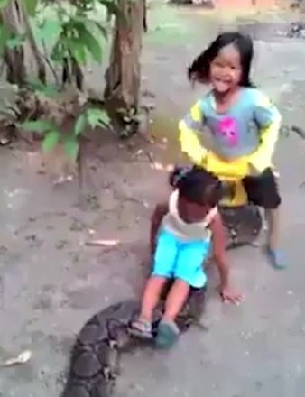 Duas meninas na Indonésia encontraram uma cobra píton e montaram nas costas da cobra gigante