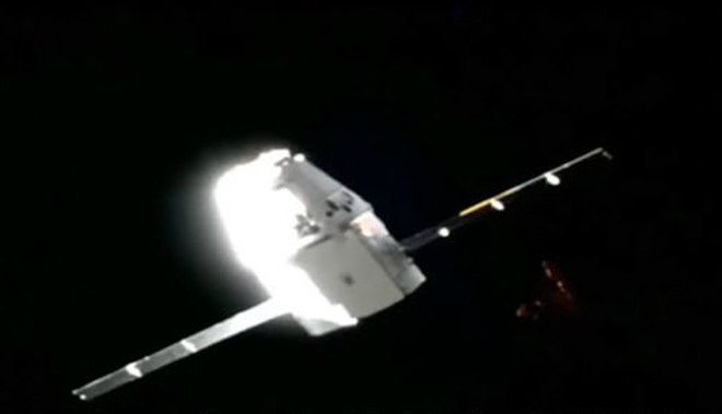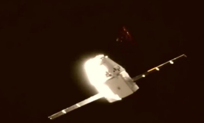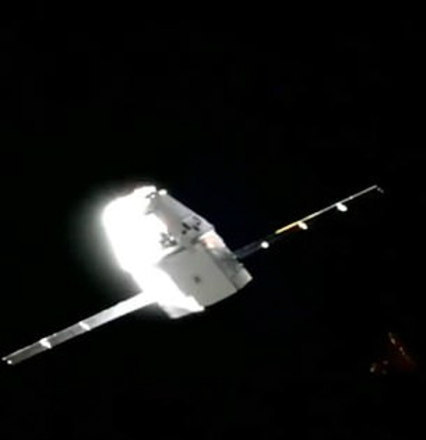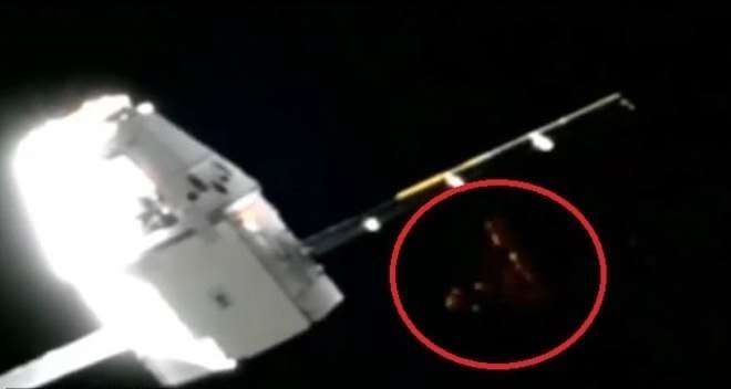 No registro, vemos um objeto triangular, emitindo luzes de diversos pontos de sua estrutura, passar raspando pela Dragon