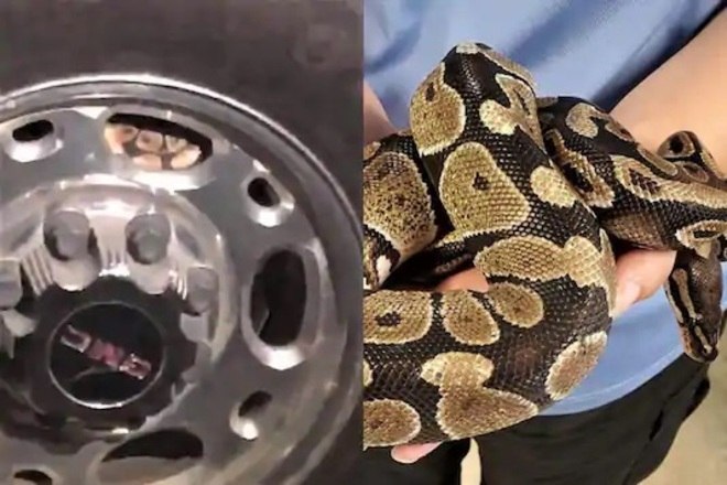 Ao perceber a aproximação dos policiais, a píton fugiu para o motor do veículo