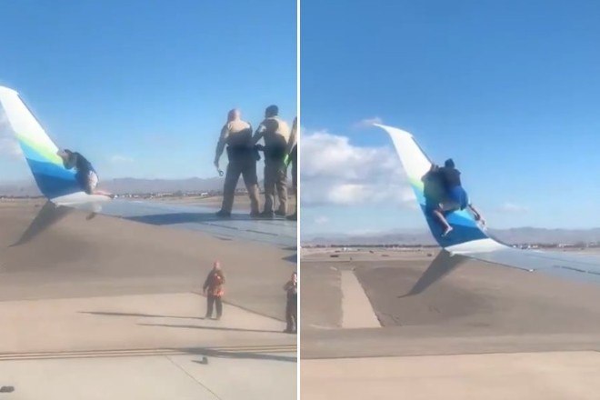 Uma homem não identificado acabou detido após empoleirar na asa de um avião e retirar os sapatos, sem nenhum motivo aparente
