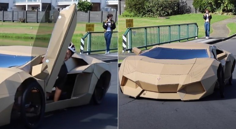 Uma Lamborghini Aventador feita de papelão foi arrematada em um leilão por valor equivalente a R$ 55 mil. O veículo foi construído pelo yotuber neozelandês David Jones, 22, que destinou o valor arrecadado a um hospital infantil de Auckland.