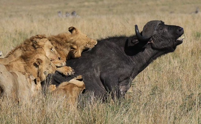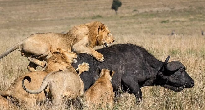 Fotos mostram que são necessários 15 leões para derrubar um búfalo