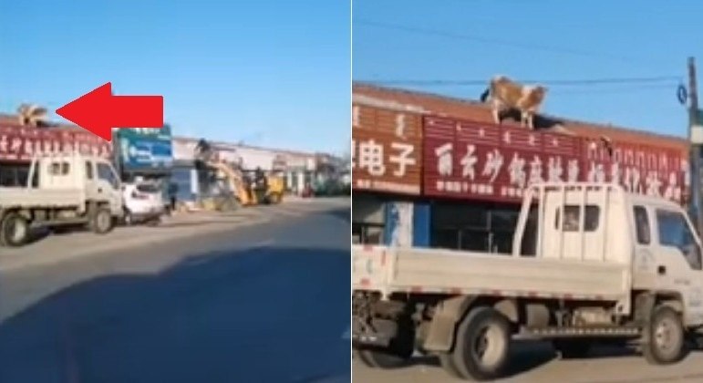 Uma vaca ficou presa no telhado de um prédio da cidade de Tongliao, na China, após uma forte nevasca ter atingido a região. As informações são do tabloide britânico Daily Mail.